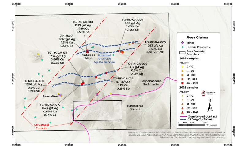 Brett Marsh, Spartan’s President and CEO, states ‘When hydrothermal fluids moving along the structural corridors interact with thick, carbonate-rich sedimentary packages at the contact with the Tungstonia Granite intrusion, we have the potential to develop an enriched depositional zone along preferred limestone and dolostone beds, at structural intersections, and where we see veining in our host rocks. The rock chip samples from 2024 returned several high-grade results that carry several of the primary metals commonly associated with carbonate replacement deposit mineralization including silver, lead, copper, and zinc. This strongly suggests the potential for a larger carbonate replacement deposit that could potentially contain significant critical metal concentrations at the Tungstonia Claim Block.’
