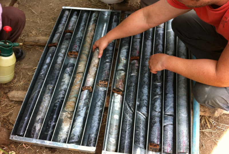 Figure 2 Drill core marked for cutting (see pink lines on core at bottom of picture).