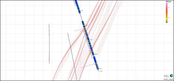 Figure 3: Cross-section of CRD034b, including sample intersection grades, and grade bars representing WO3 results. Zones in pink represent the previously modelled high-grade zones that form the basis of Redmoor mineral resource. The modelled high-grade zones towards the bottom of the hole, falls short of the drill holes trajectory, and following the intersection of a further significant width high grade intersection in CRD034b highlights the potential for resource growth should the zone be extended.