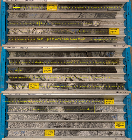 - 0.75 m @ 1.21% WO3, 4.73% Cu & 0.05% Sn from 583.30 m (2.53% WO3.Eq)
