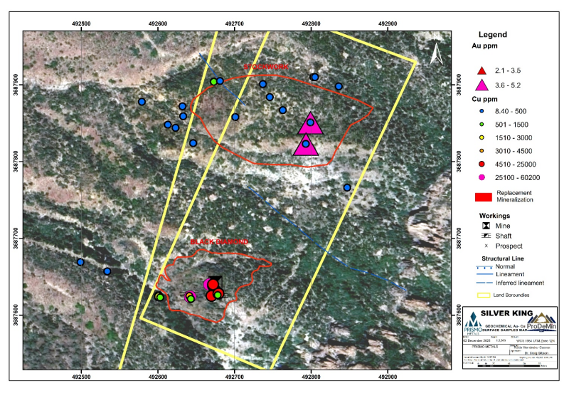 Vancouver, British Columbia TheNewswire – December 3rd, 2025 Prismo Metals Inc. (‘ Prismo ‘ or the ‘ Company ‘) (CSE: PRIZ,OTC:PMOMF) (OTCQB: PMOMF) is pleased to announce it has received assay results for samples recently taken at the Silver King Project from two exploration targets located on the east side of the property, namely the Black Diamond replacement target and the newly named Crown porphyry intrusion target (Fig. 1).