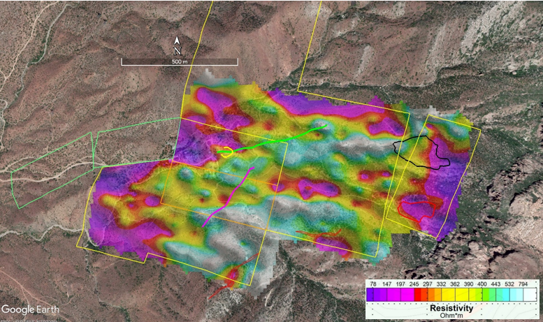Figure 3. IP resistivity map showing exploration targets: yellow line-Silver King glory hole, magenta line-polymetallic vein, green line-copper vein, red outlines-Black Diamond replacement body and stratigraphically controlled replacement horizons, black outline-stockwork intrusion.