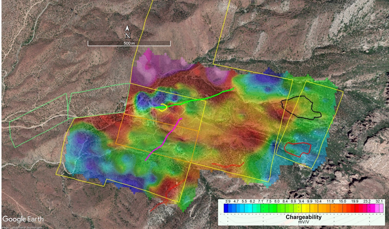 Figure 4. IP chargeability map showing exploration targets: yellow line-Silver King glory hole, magenta line-polymetallic vein, green line-copper vein, red outlines-Black Diamond replacement body and stratigraphically controlled replacement horizons, black outline-stockwork intrusion.