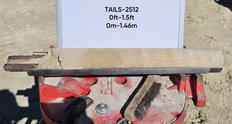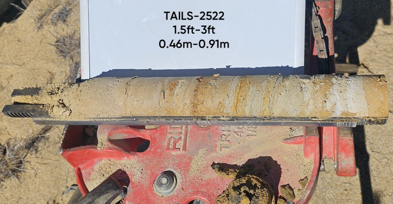 34 holes (Figures 1 to 3) were advanced vertically into the legacy tailings using a truck mounted auto hammer equipped hollow stem auger rig – the auger was not required because the coarse sand sized tail material is well compacted and the auto hammer advanced well and returned high quality samples. Each hole was advanced through the entirety of the tailings until native ground was encountered. Recovery was excellent at near 100% for all collected samples, representative images are shown in Figures 4 to 6. Samples were collected at 0.46 m (1.5 ft) and 0.61 m (2 ft) intervals from surface using 6.4-centimeter (2.5-inch) California split spoon tube sampler equipped with sand catcher. The full sample was placed into 11’x17′ Nano-Por Geological sample bags, sealed, and delivered to American Assay Lab (AAL) in Reno, Nevada for assay with representative material saved in chip trays for preservation. Field duplicates were obtained by splitting the sample into two equal portions and following the same procedures as full samples.