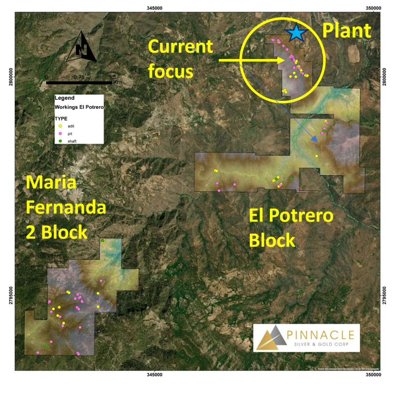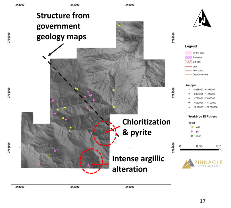 On the separate Maria Fernanda 2 (‘MF2′) claim block to the southwest (Figure 3), 3 shafts, 14 adits and 22 pits are somewhat scattered across the concession. While this area has never been explored by modern methods, government maps indicate a northwest-southeast trending structure passing through the middle of the block, parallel to the Dos de Mayo system and to the regional structural trend. The LiDAR also indicates a number of smaller structures perpendicular to this trend. The road from Topia passes through the middle of the block and road cuts locally display intense argillic alteration and pervasive chloritization with minor pyrite that, collectively, may be indicative of a buried hydrothermal system. Several of the pits interpreted from the LiDAR appear to lie in close proximity to this zone. Pinnacle’s geological team is planning a systematic and thorough evaluation of the area, commencing early in the New Year.