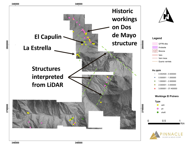 ‘The LiDAR survey was highly successful in confirming the 1,600 metre known strike length of the Dos de Mayo vein system and, perhaps more importantly, has identified new structures, often with artisanal workings that may indicate the presence of vein material,’ stated Robert Archer, Pinnacle’s President & CEO. ‘The sheer number of historic shafts, adits and pits interpreted from the LiDAR survey underscores the prospectivity of the project and, to date, we have focused only on the northernmost 10% of the property. As such, we are adding to our geological team to follow up on these new targets.’