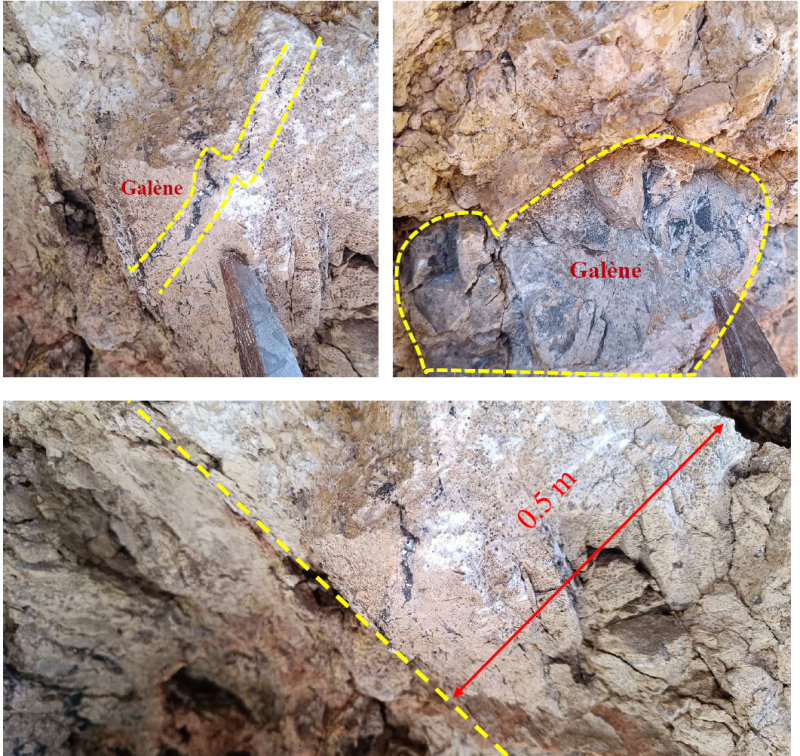 The veins on the project area exhibit thicknesses ranging from approximately 0.50 to 4.00 m. According to their orientation, the strike of these vein structures ranges from NE–SW to NNE–SSW. During the most recent field visits, a set of copper and lead indications were identified within the carbonates and along the major regional fault of Tizi n’Test all hosted within the same marly to marly‑sandstone facies. A number of these occurrences have been subject to exploitation (artisanal mining) of varying duration. See Figures 5 and 6. The steeply-dipping veins exhibit characteristics consistent with known copper-lead-silver veins throughout the mining district.